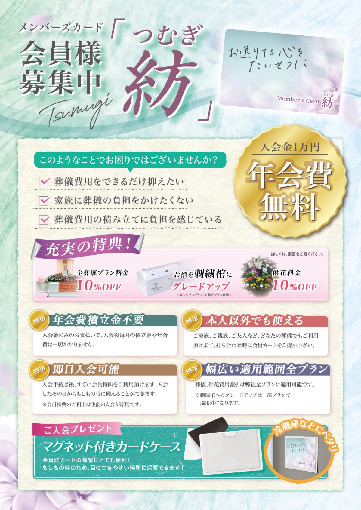 ご家族、ご親族、ご友人など、どなたの葬儀でもご利用頂けます。打ち合わせ時に会員カードをご提示下さい。